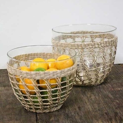 Woven Seagrass wrapped glass Serving Bowls that have multi-use for mixing, serving, salad and fruit.